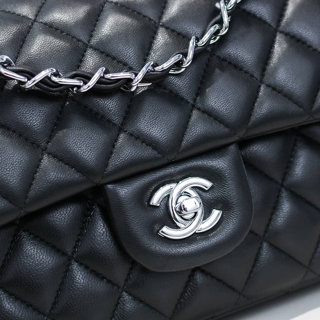 The Chanel Classic in black quilted leather epitomizes sophisticated luxury, featuring the iconic diamond quilting and silver-toned CC turn-lock that makes it a quintessential piece for any high-end collection.