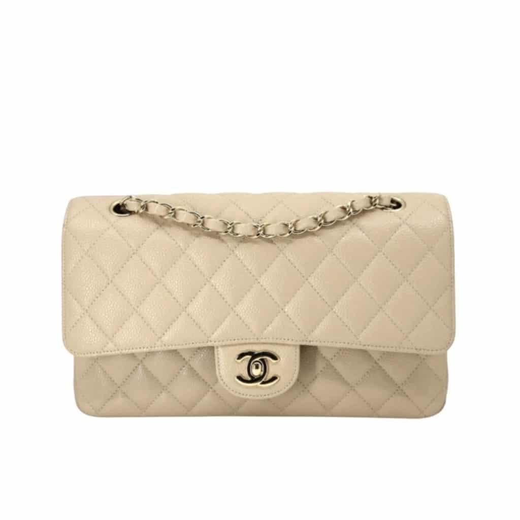 The Chanel Classic Medium Double Flap in beige quilted leather is an enduring symbol of elegance, featuring the signature diamond quilting, a versatile sliding chain strap, and the iconic CC turn-lock closure that defines high-fashion sophistication.