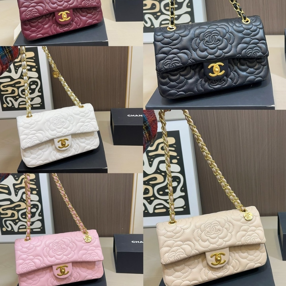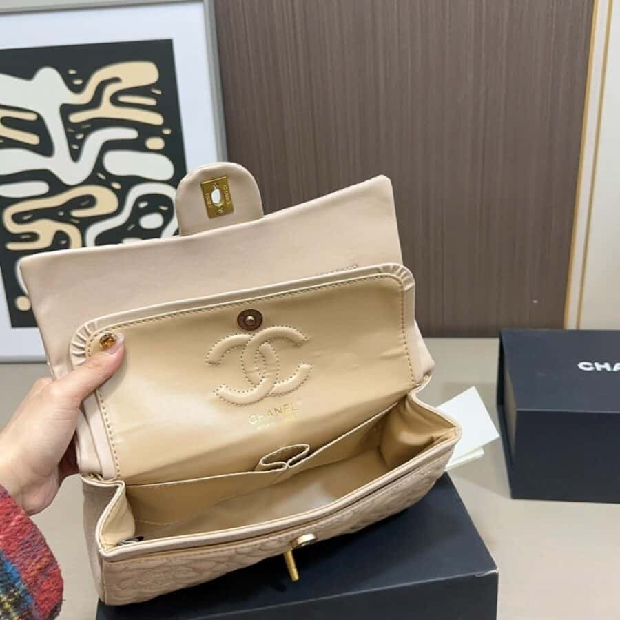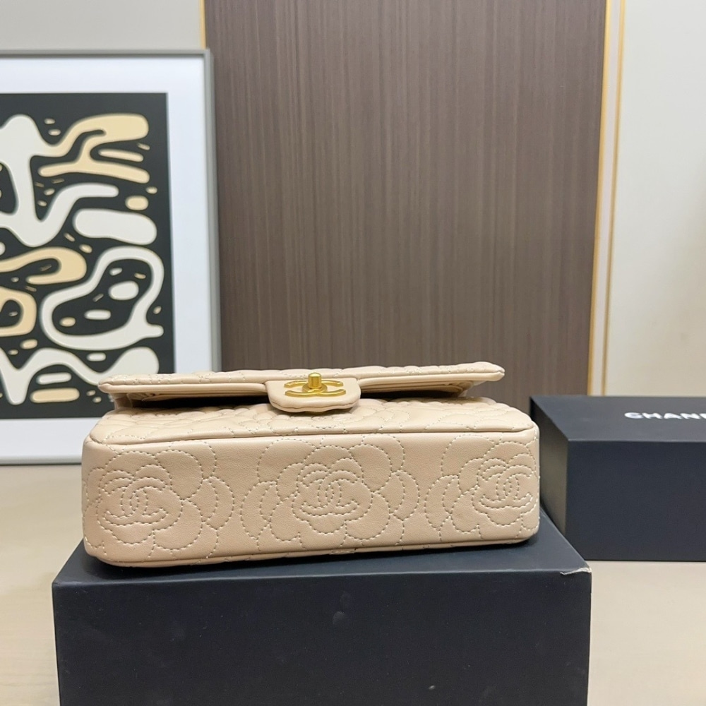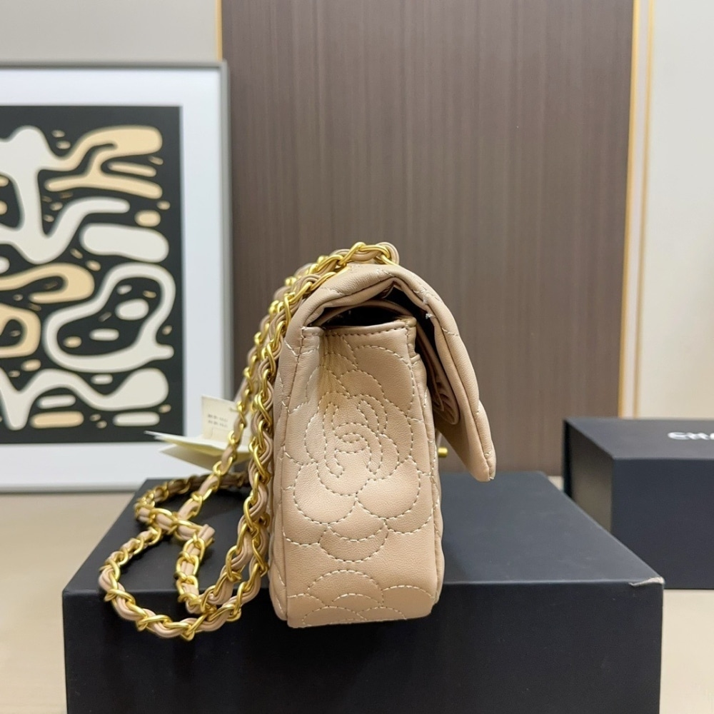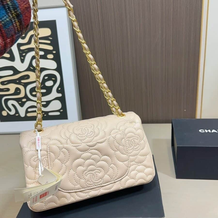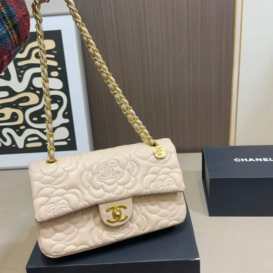 The Chanel Flap Bag in beige leather is a poetic masterpiece, featuring exquisite all-over Camellia flower embroidery—Mademoiselle Chanel’s iconic floral signature. Complemented by a unique gold-tone chain accented with a delicate Camellia charm and the classic CC turn-lock, this bag is a sophisticated blend of romantic heritage and modern luxury.