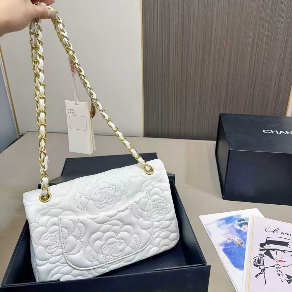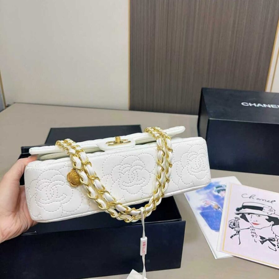 The Chanel Flap Bag with Camellia Flower Chain in white is a accessory that showcases the brand’s romantic side through exquisite Camellia floral embroidery. This elegant piece is crafted from quilted leather and features a unique gold-tone metal chain intertwined with a decorative Camellia flower charm. Secured by the iconic CC turn-lock, its medium size and timeless white hue make it a perfect statement bag for adding a touch of sophisticated femininity to any look.