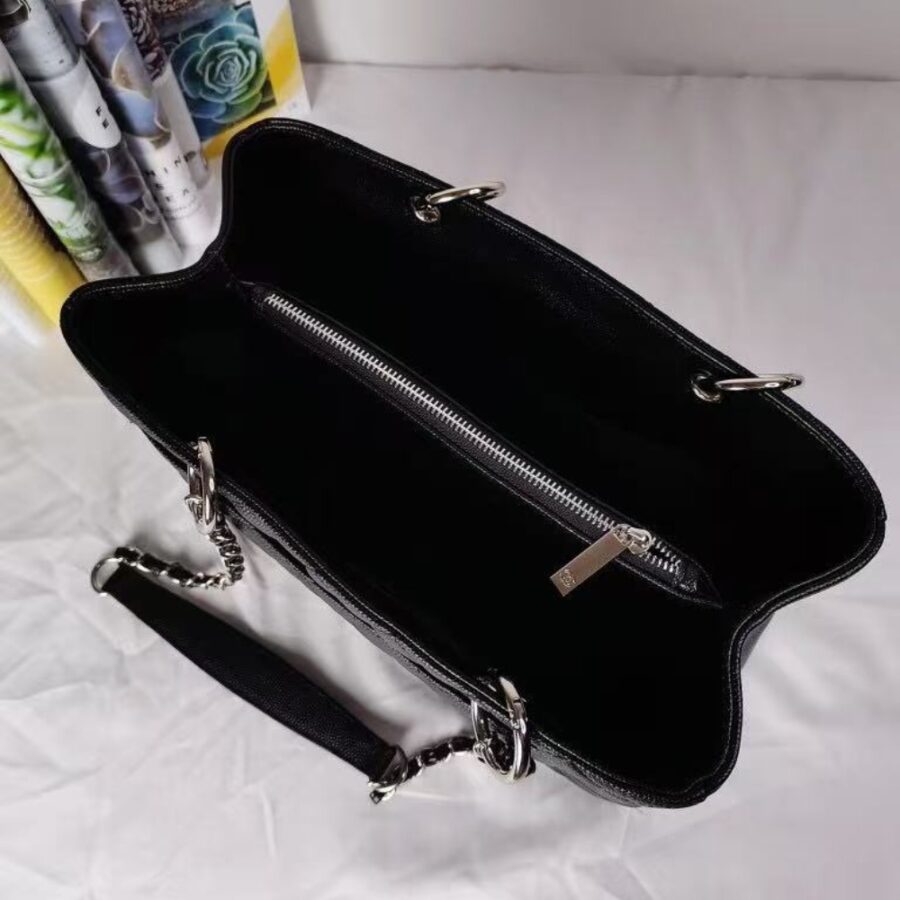 Chanel Grand Shopping Tote Bag Black Caviar Silver Tone Chain 34Cm