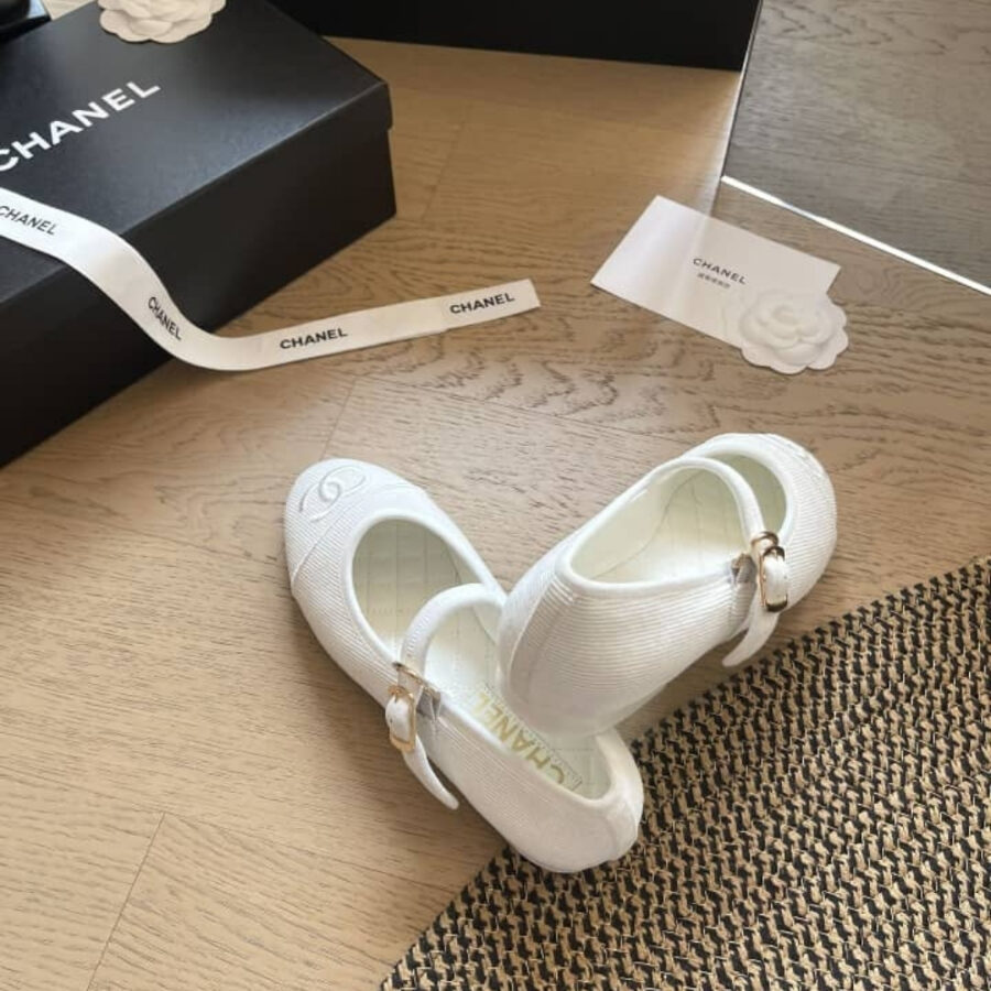 The Chanel Mary Jane Ballet Flats in white are a sophisticated take on a classic silhouette, featuring a clean fabric finish and the iconic CC logo embroidered on the toe. The design is elevated by an elegant instep strap with a polished gold-tone buckle, ensuring a secure and comfortable fit for all-day wear. With their luminous white palette and timeless Parisian charm, these flats effortlessly complement everything from tailored trousers to airy seasonal dresses.