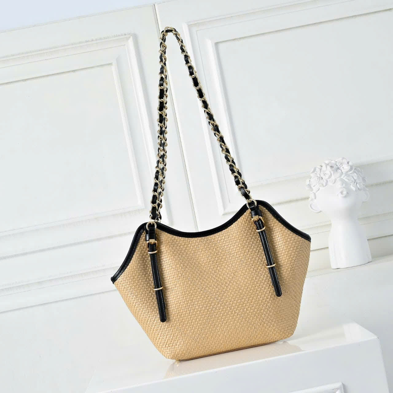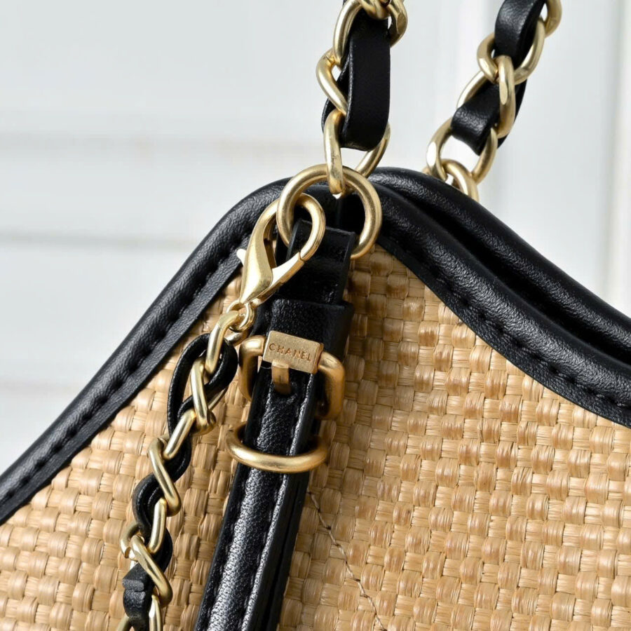The Chanel Medium Shopping Bag in braided raffia features a natural beige texture contrasted with sleek black leather trim and iconic gold-tone hardware, delivering a sophisticated yet relaxed aesthetic perfect for both coastal escapes and city strolls.