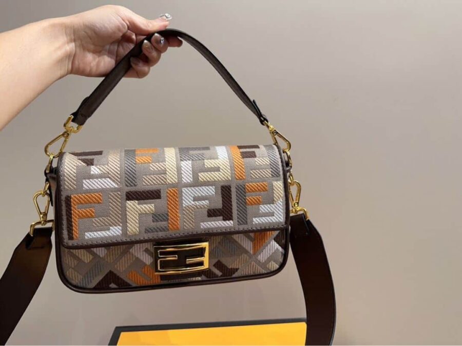 - Gray canvas with a raised FF motif embroidered in multicolor yarn.