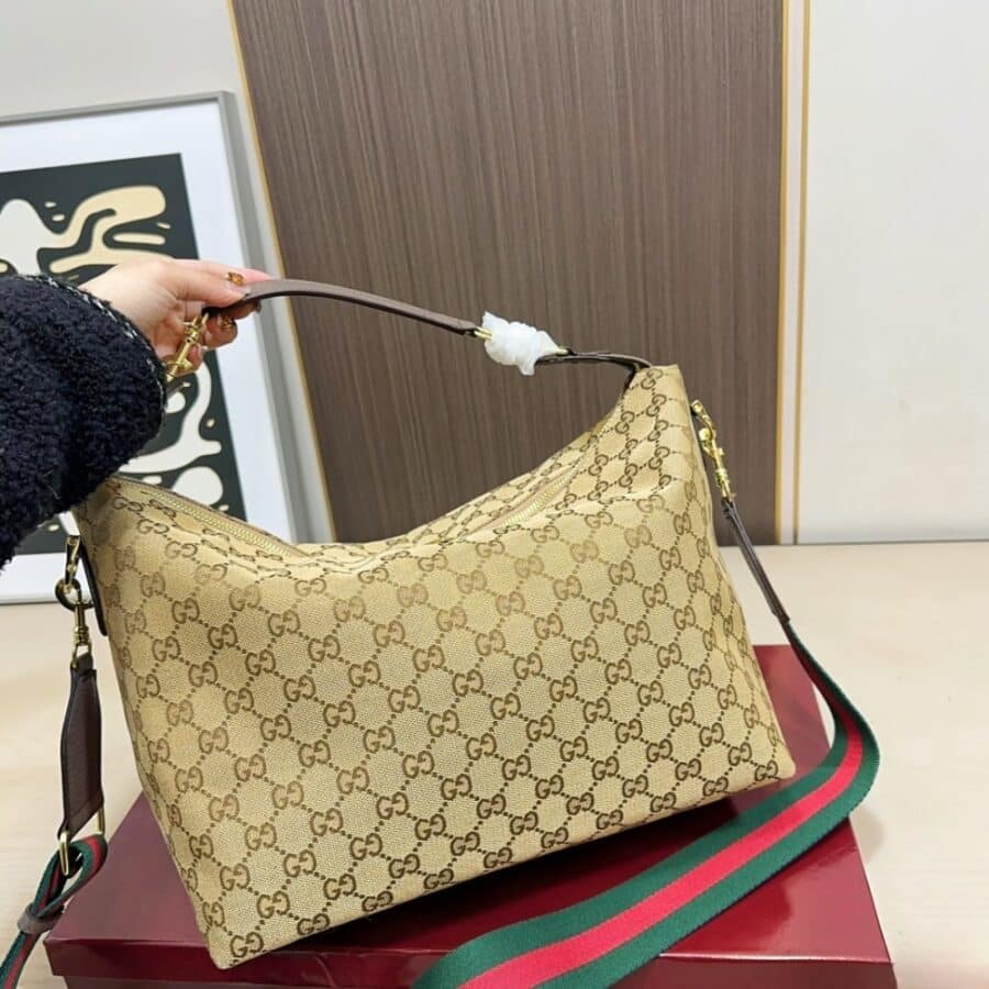 Gucci Brera Medium Crossbody Bag / GG Canvas / Sand and Dark Brown / 13.0 x 4.7 x 10.2 inches / Gold-toned hardware / Fits tablet, smartphone, long wallet, and cosmetics / Elegant and functional crossbody bag
