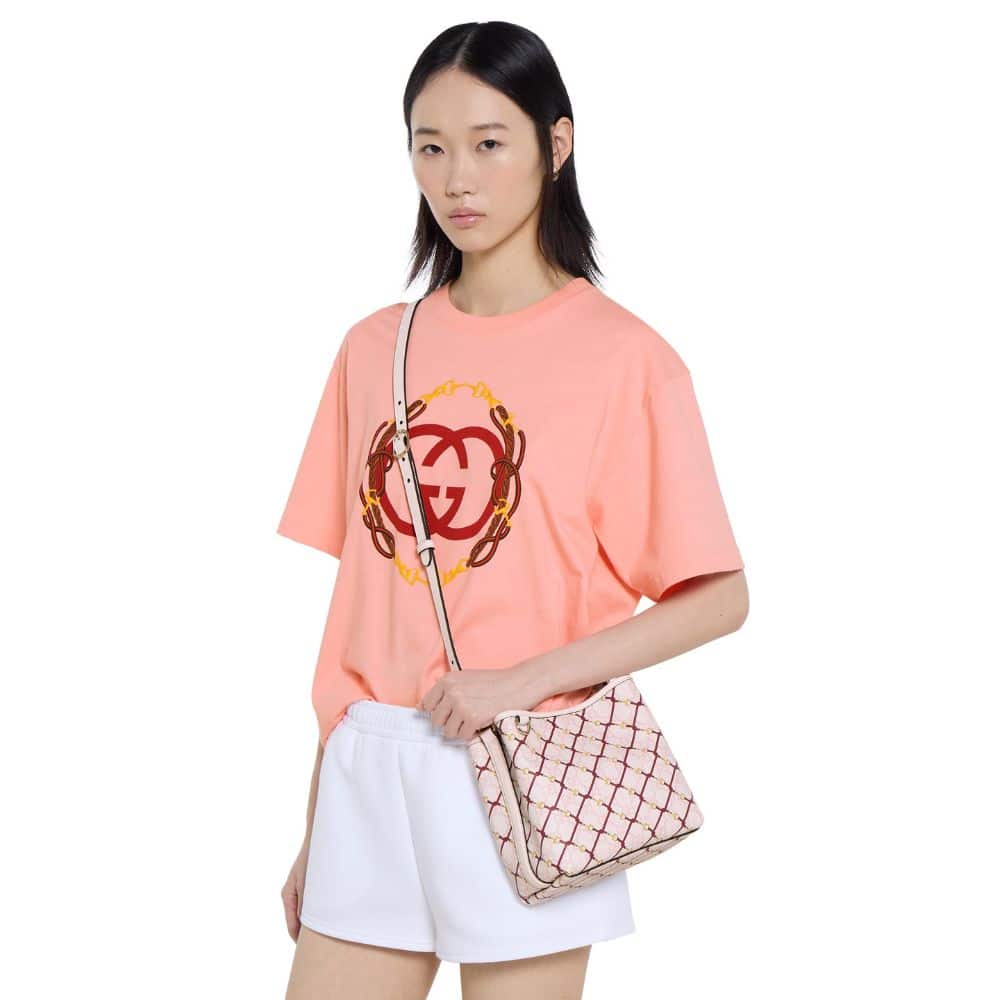 The GG Emblem collection reinterprets the House’s history of elegance and craftsmanship. Highlighting a stirrup motif over the GG Monogram coated fabric, this bucket bag enriches functional design with an interior compartment in Web cotton lining.