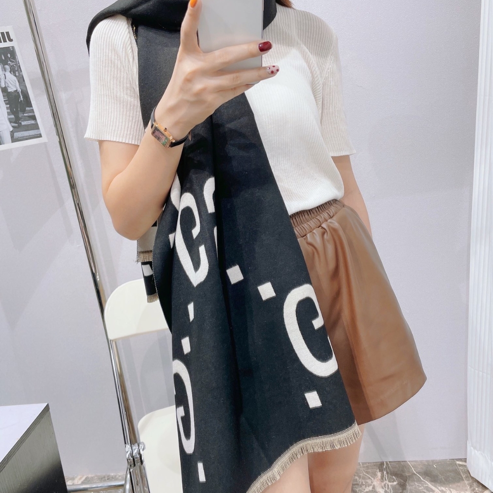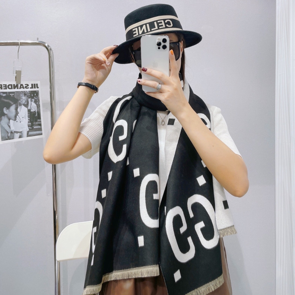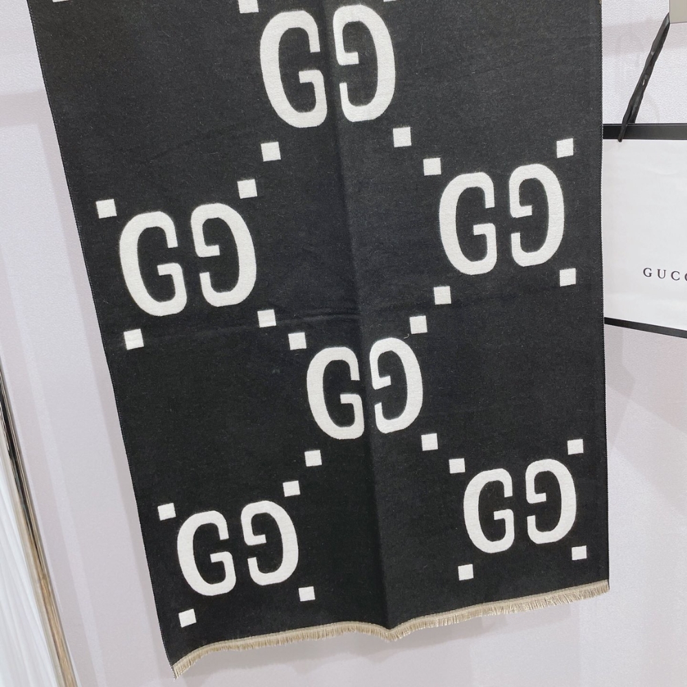 GUCCI GG JACQUARD WOOL SILK SCARF BLACK WHITE 180CM