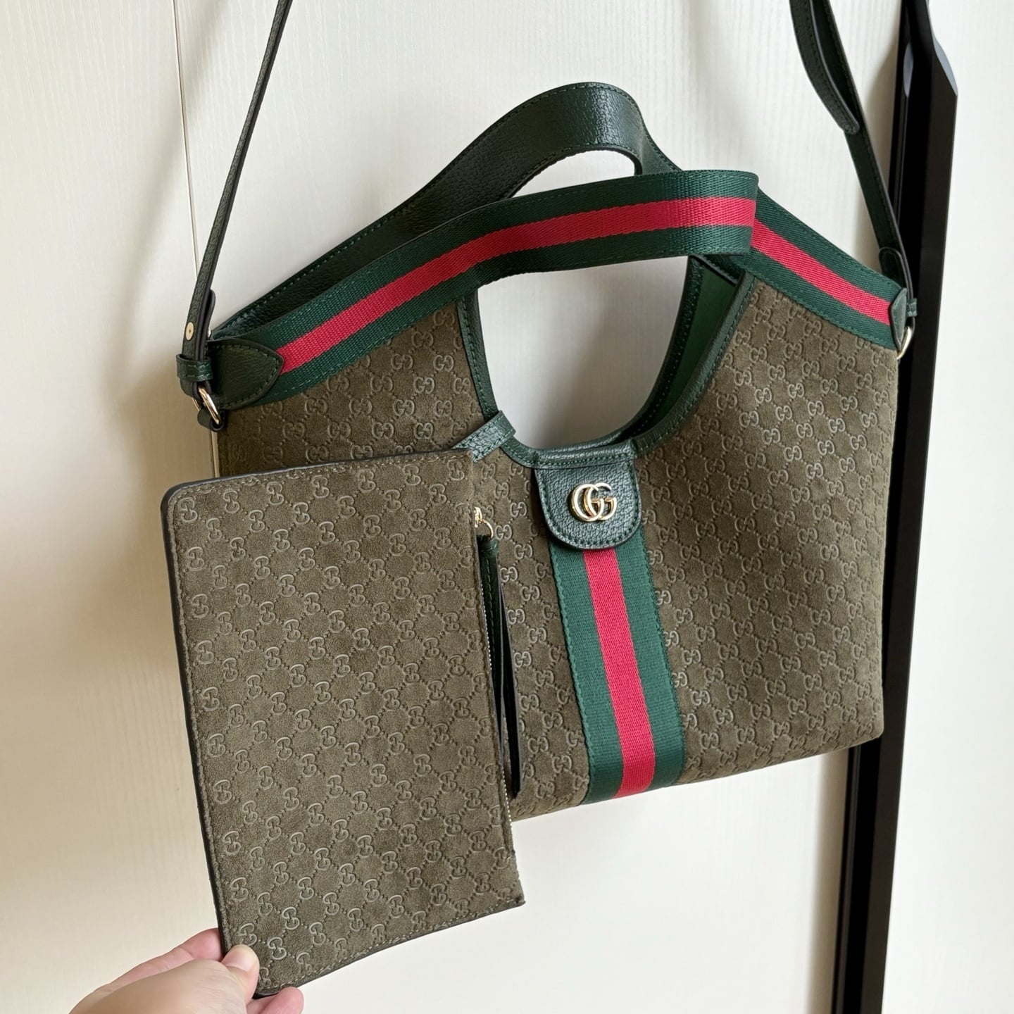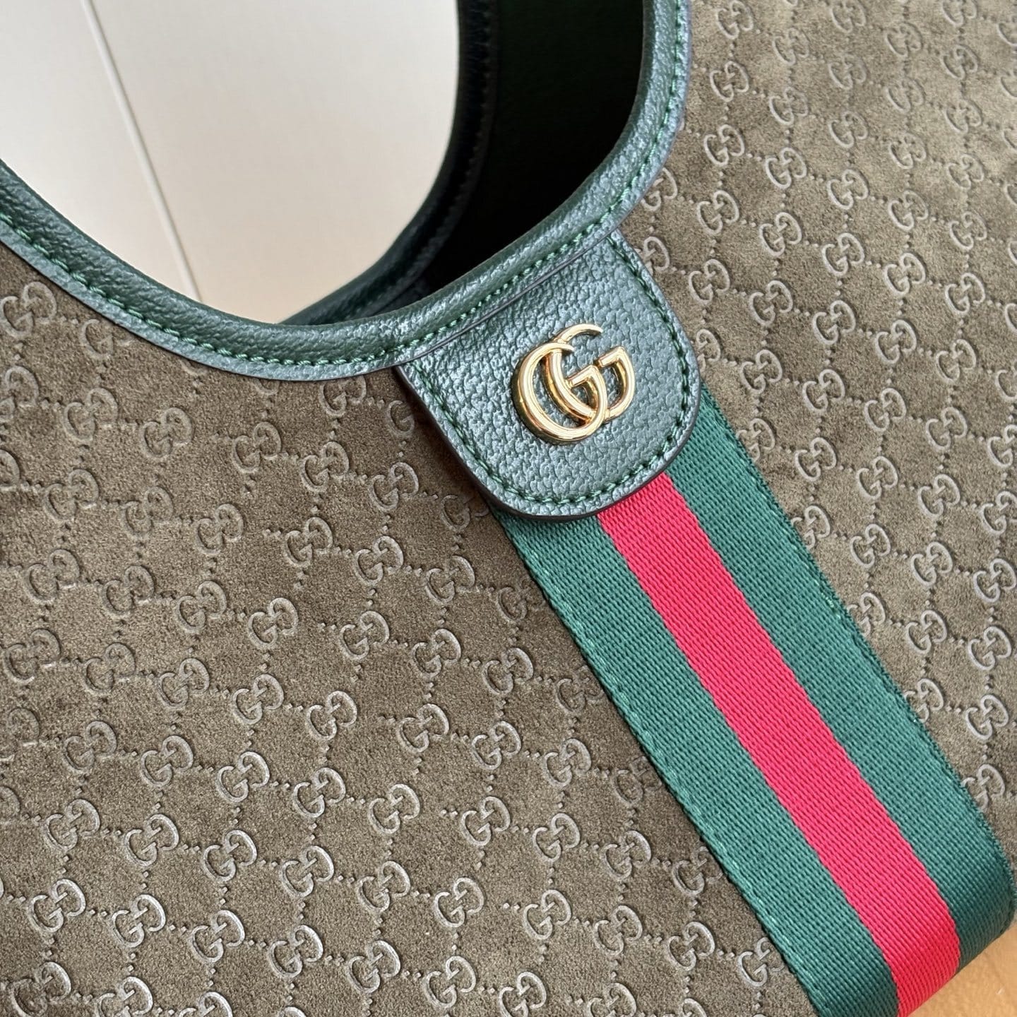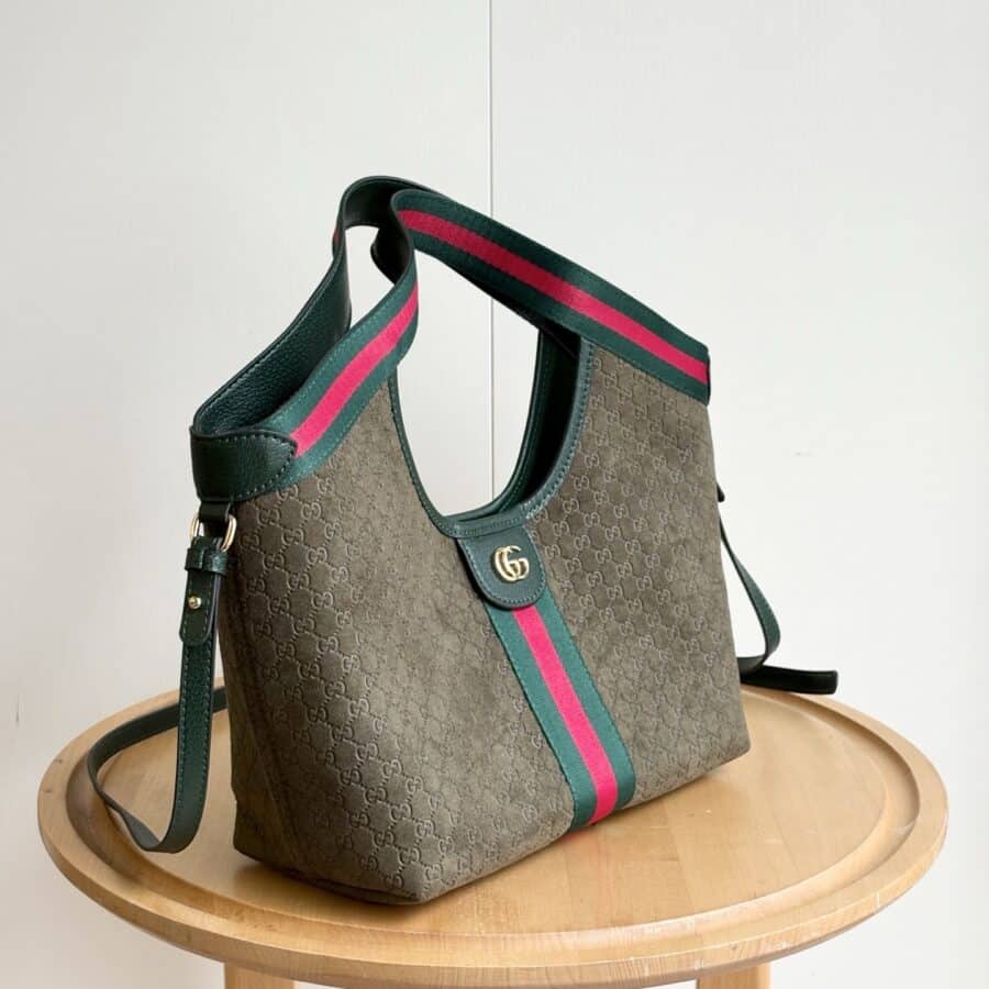 The Gucci Giglio Small Tote Bag in dark green that debuted as part of the Cruise 2026 collection. Crafted from GG canvas with dark green leather trim, this sculptural bag features iconic green and red Web stripes and light gold-toned hardware. The functional design includes a hidden magnetic closure, a detachable interior pouch, and an adjustable leather shoulder strap for effortless transition between a top handle and a crossbody carry.
