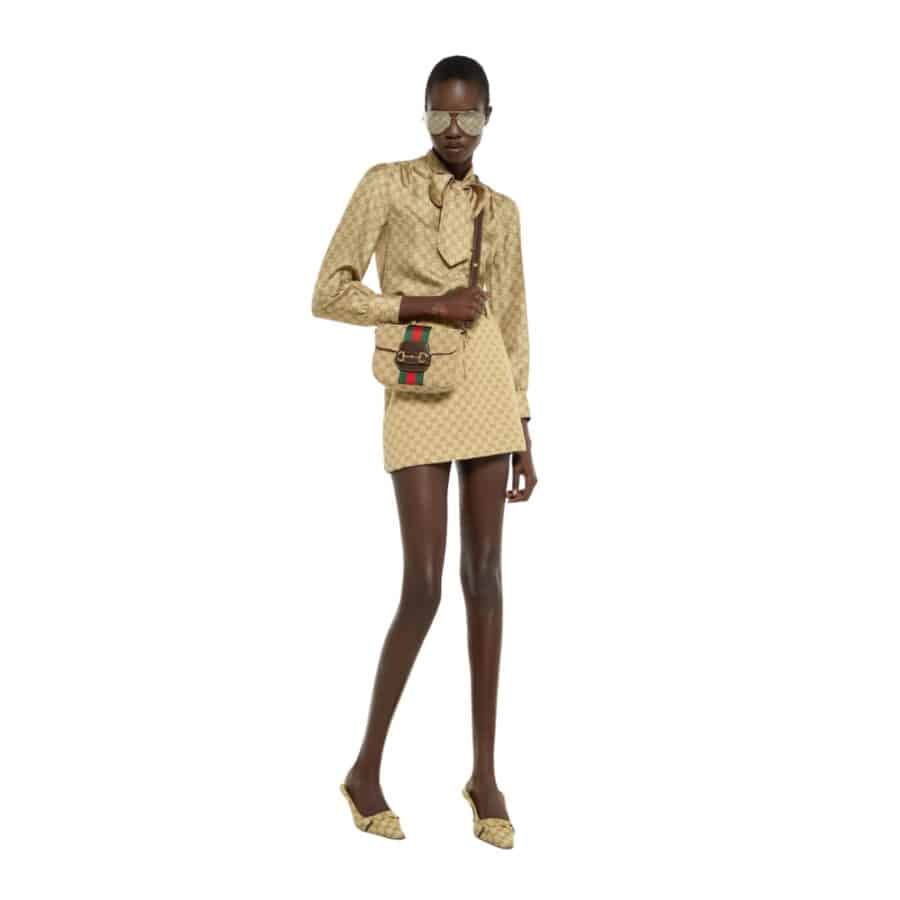 Introducing Spring Summer 2026. Gucci Horsebit 1955 proposes a soft, supple shape. Crafted from lightweight yet structured GG canvas, the style is complete with the Web detail and a sleek adjustable leather strap.