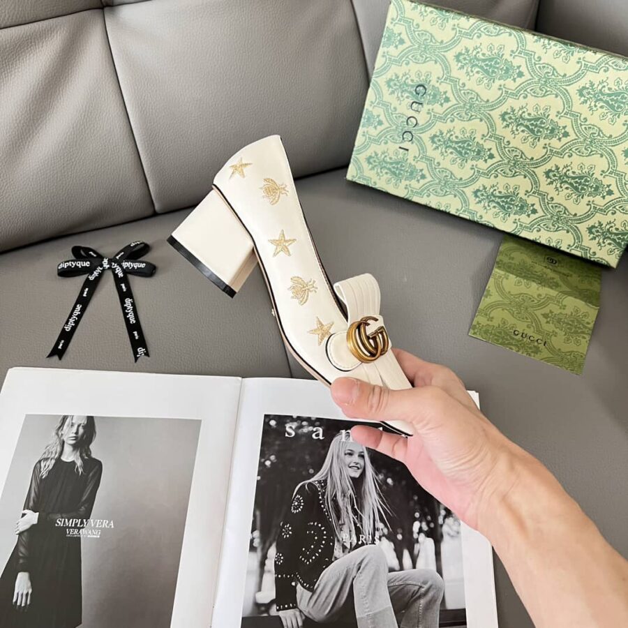 GUCCI MARMONT EMBROIDERED LEATHER MID HEEL PUMP BEE STAR WHITE 551548 D3V00 9022