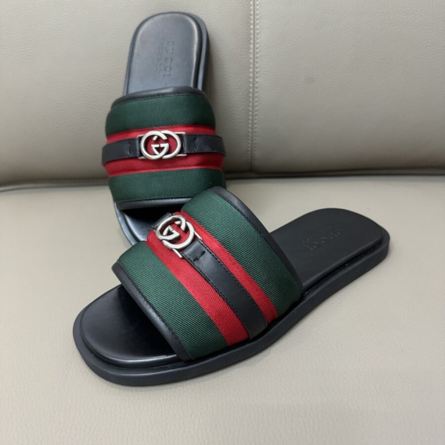 GUCCI MEN SLIDE SANDAL WITH INTERLOCKING G GREEN AND RED ‎835091 HAAHH 8449