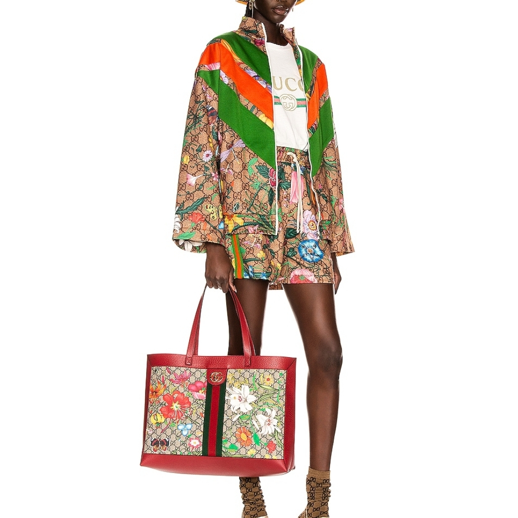 The Gucci Ophidia GG Flora Medium Tote in Green blends classic GG Supreme canvas with the vibrant Flora print for a striking look. Accented with green leather trim and the iconic Web stripe, this spacious tote offers timeless elegance and practicality. Ideal for making a bold yet sophisticated statement.