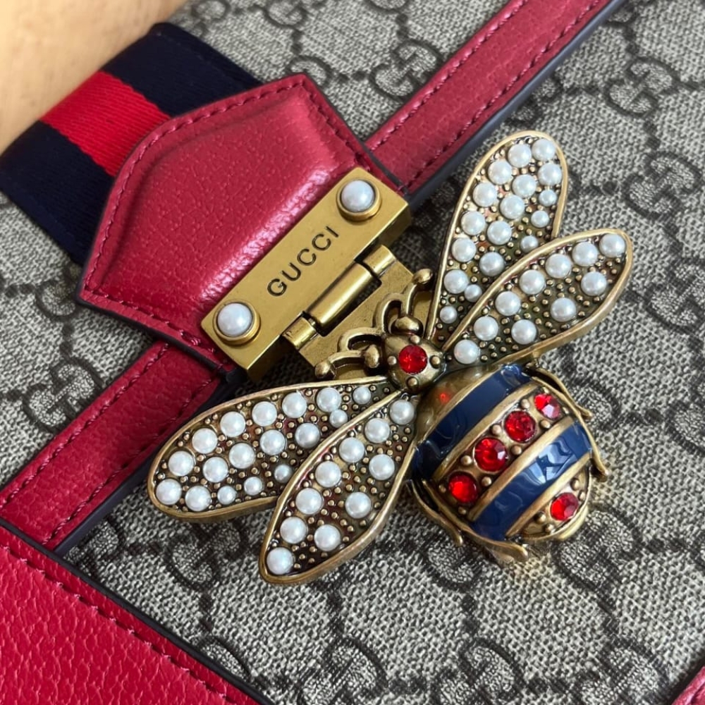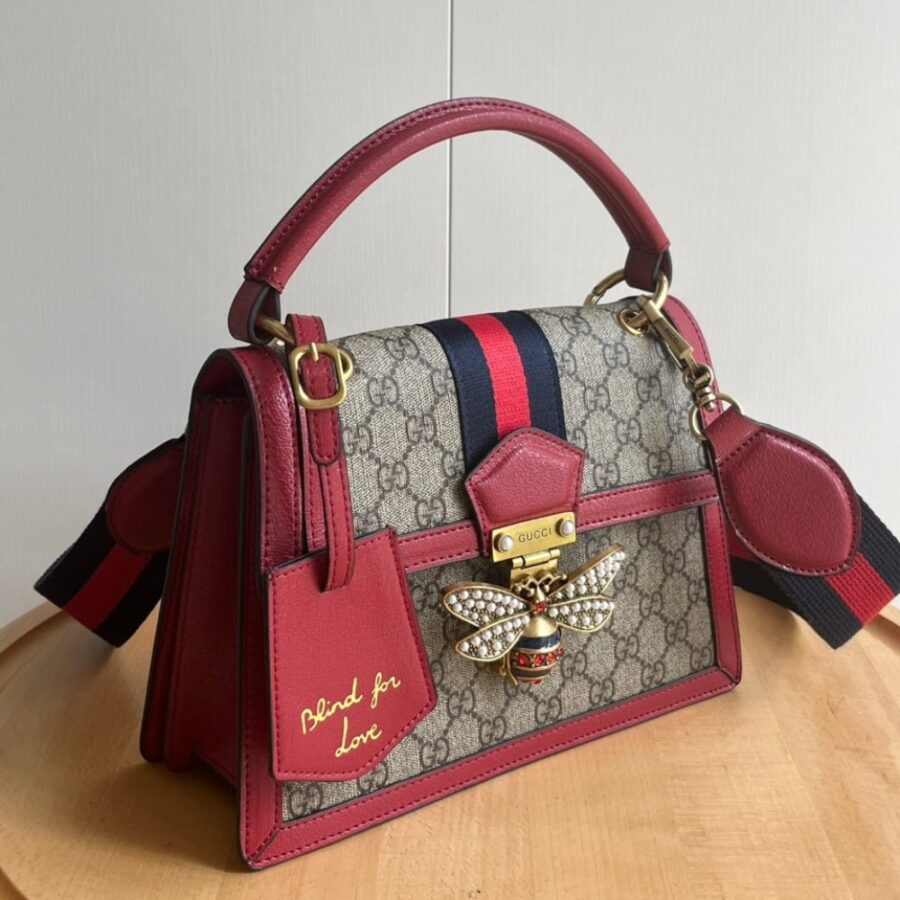 The Gucci Queen Margaret GG Small Top Handle Bag blends iconic house codes with a romantic flair, featuring a striking metal bee encrusted with glass pearls and crystals for a sophisticated and regal finish.