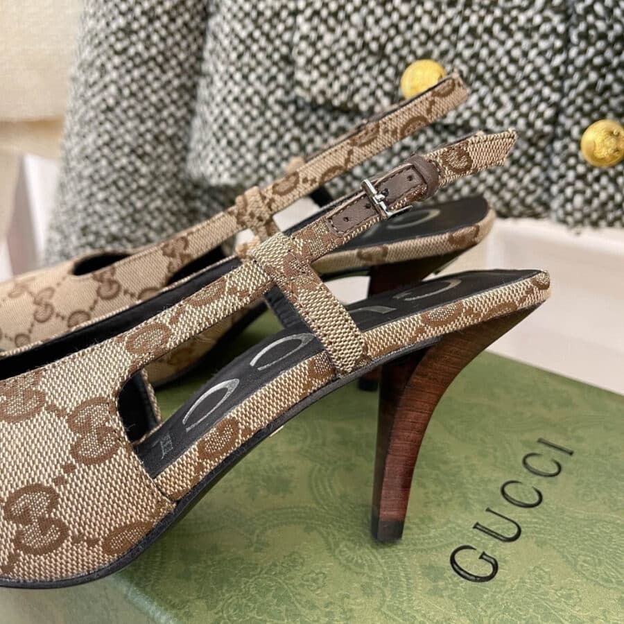 The Gucci Aria collection takes references from the archives of the ’90s and early ‘2000s, with pieces inspired from Tom Ford’s era in Gucci. The new idea of femininity shows glamorous details, such as lace, crystals and sheer fabrics. This pair of slingback shoes are presented in beige and ebony Original GG canvas for a strong logo feel.