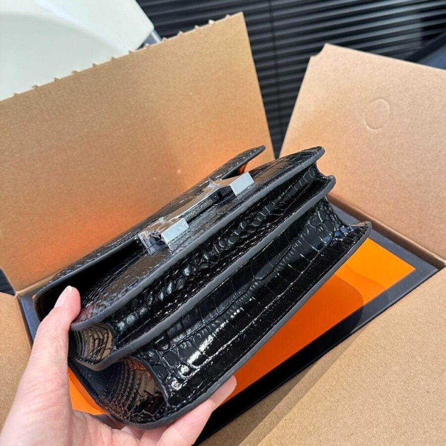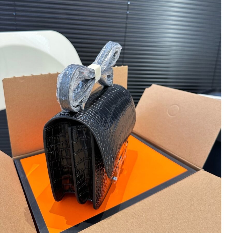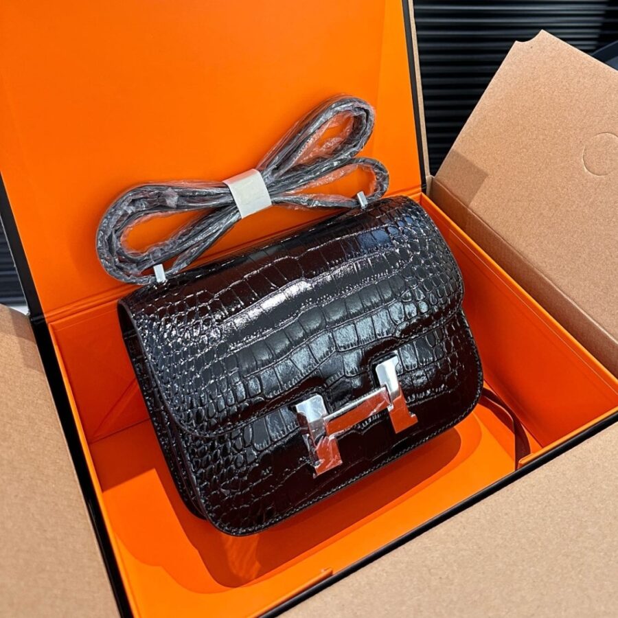 Hermès//Mini Constance 19 Shiny Alligator Palladium Hardware//Black//19cm