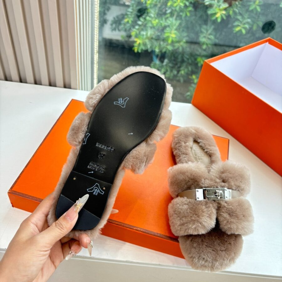 HERMES SHEARLING FUR ORAN SILVER BUCKLE SANDAL BEIGE