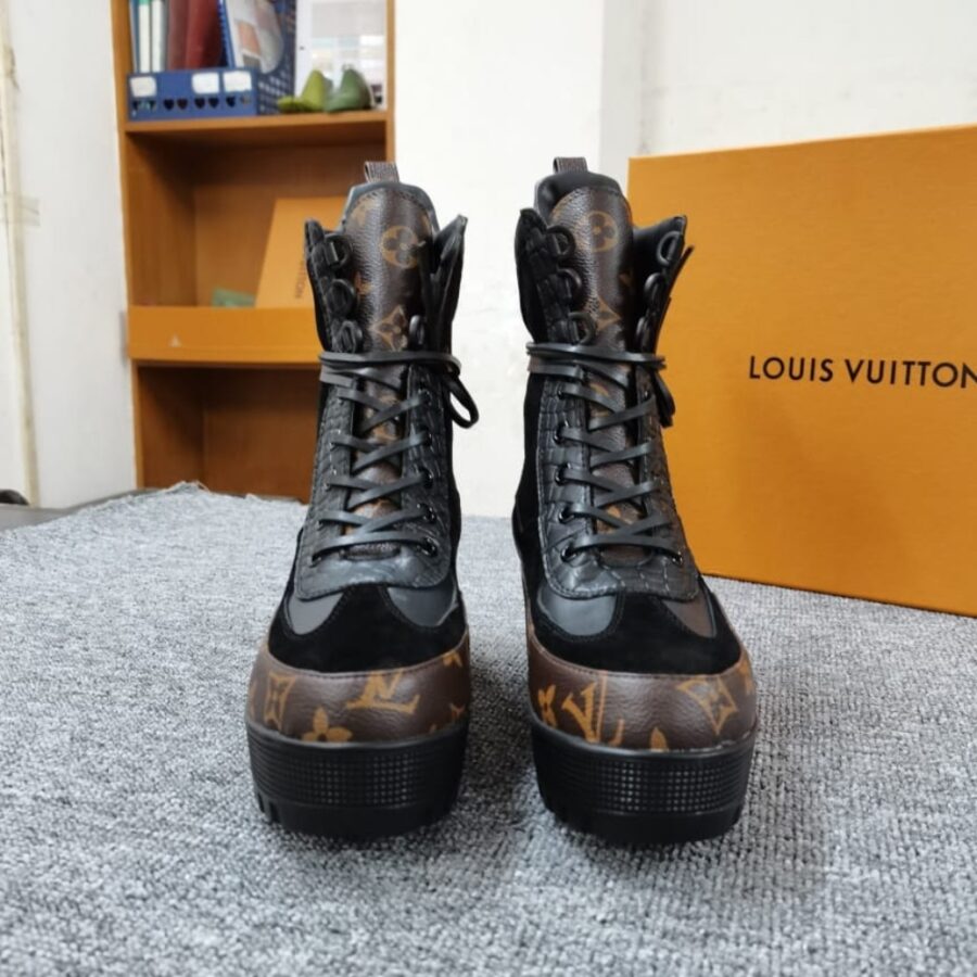 The Louis Vuitton Laureate Platform Desert Boot in Black is one of the Maison’s most recognizable shoe styles, celebrated for its adventurous spirit and bold fashion appeal. This ankle-high boot seamlessly blends rugged utility with high-fashion luxury, featuring a distinctive platform construction and wrap-around leather laces.