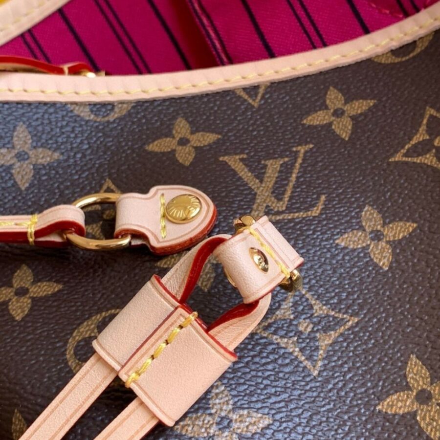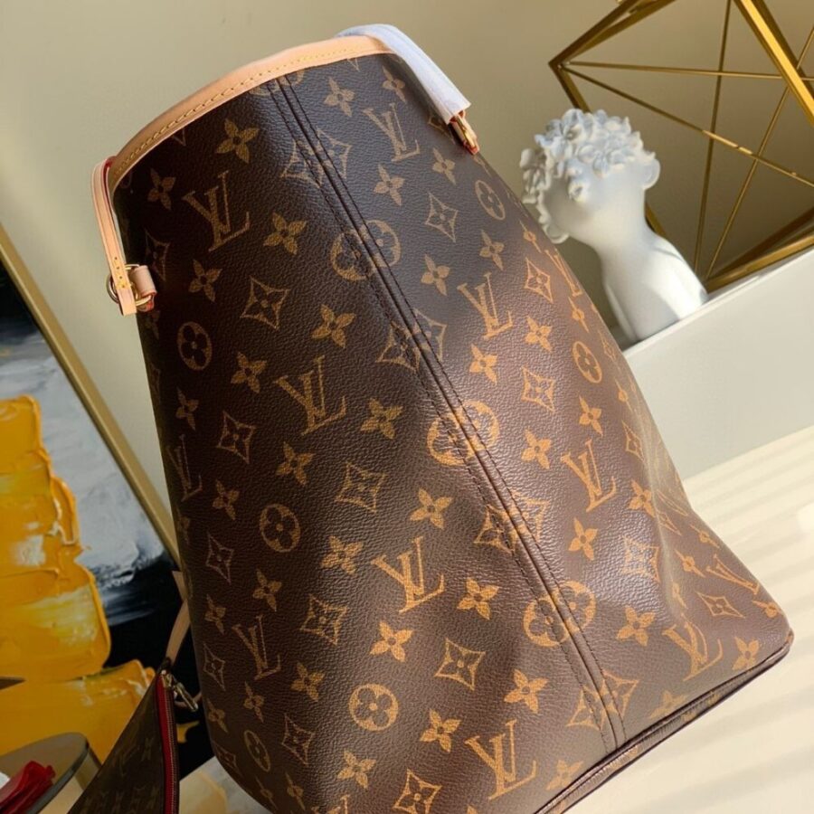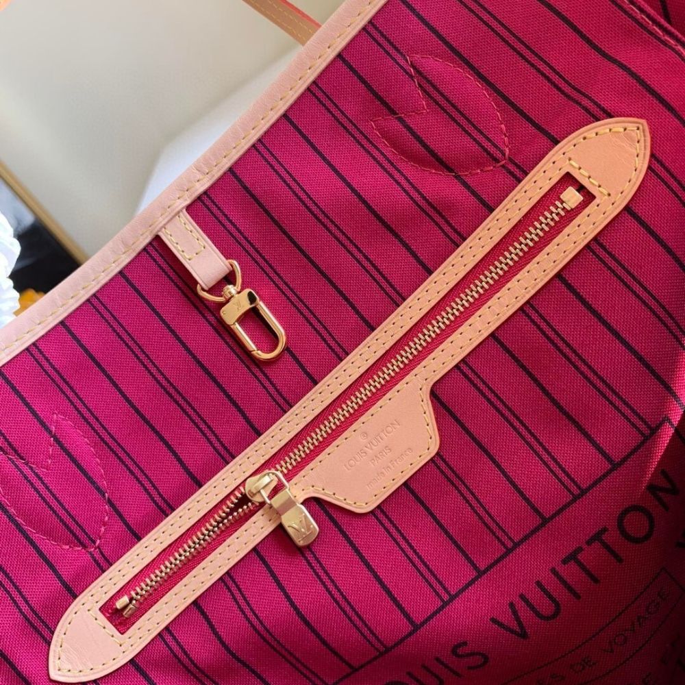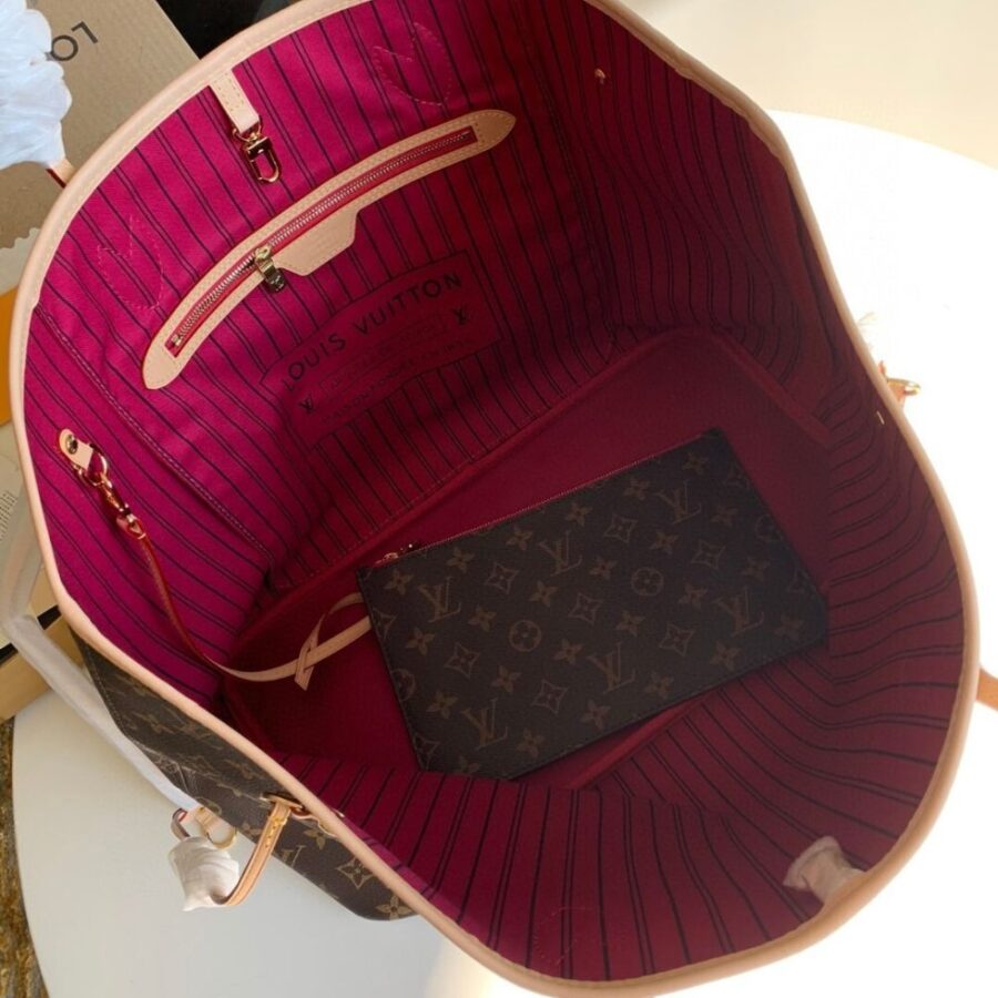 The Neverfull GM tote unites timeless design with heritage details. Made from supple Monogram canvas with natural trim, it is ultra-roomy but never bulky, with side laces that cinch for a sleek allure or loosen for a more casual look. Slim, comfortable handles slip easily over the shoulder or arm. Lined in colorful textile, it features a removable pouch which can serve as a clutch or an extra pocket.