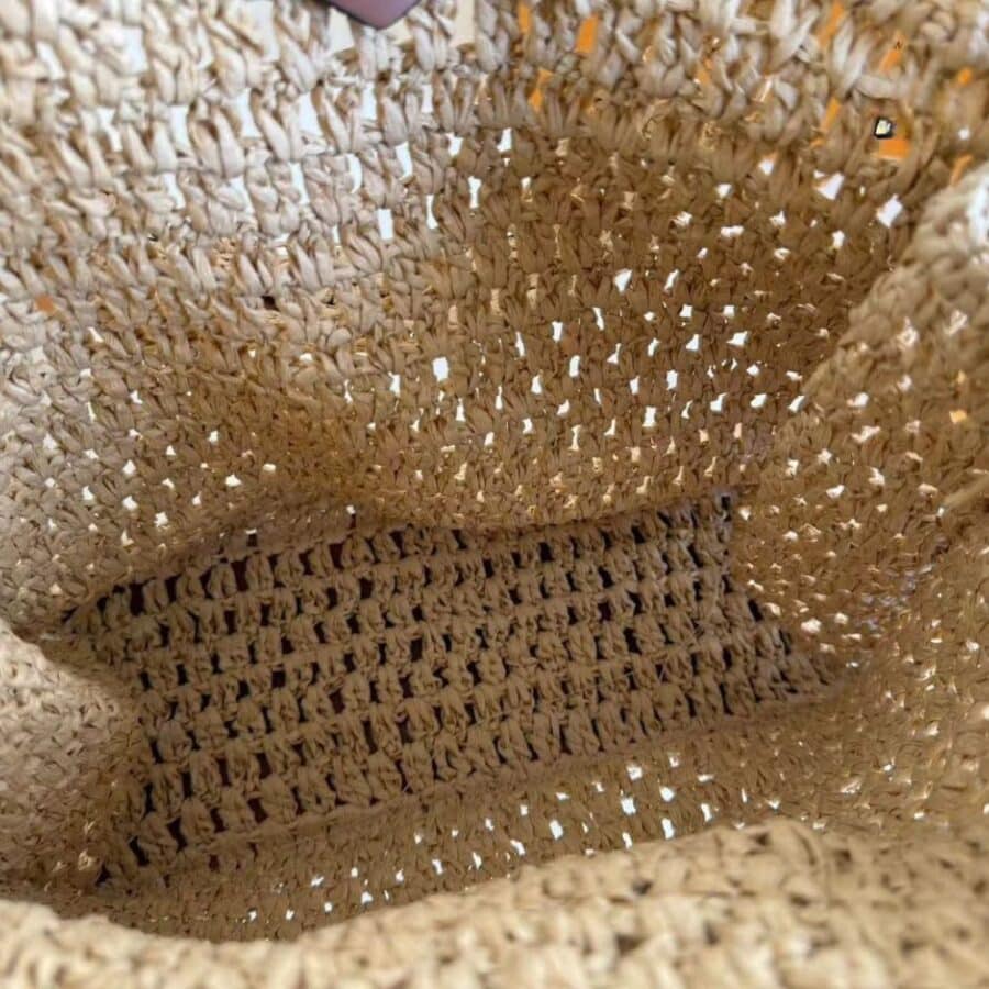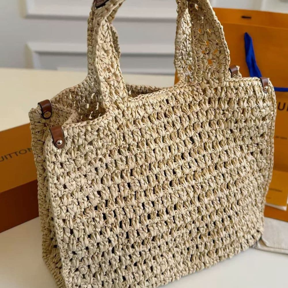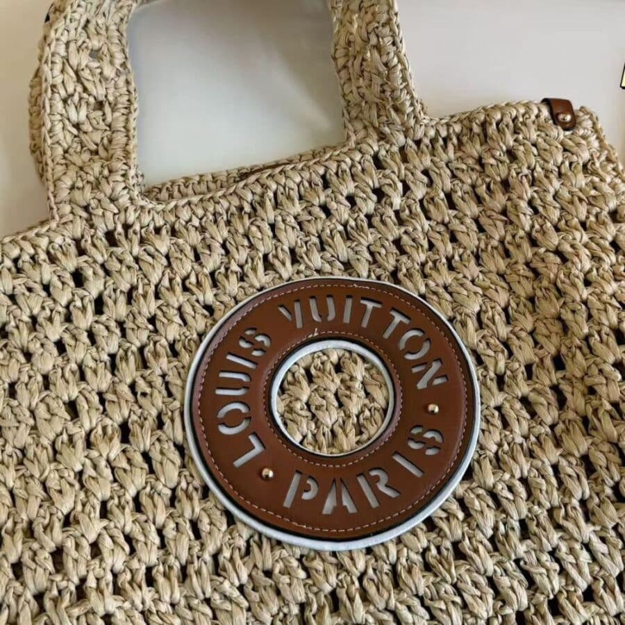 As part of the LV By The Pool Collection, the OnTheGo MM tote is made from hand-crocheted 100% natural raffia. The riveted corners are in cowhide leather, as is the circular “Louis Vuitton Paris” patch on the front. The OnTheGo MM can fit 13-inch laptop and a beach towel as well other essentials.