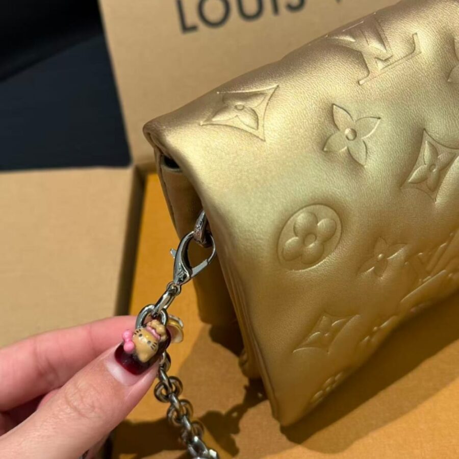 The Pochette Coussin is crafted from soft leather, which is embossed with the Monogram pattern to create a puffy, cushiony effect. This is further enhanced by the construction of the pouch, which gives it a supple, body-friendly shape. The removable chain, decorated with a Louis Vuitton charm, offers different carry options: clutch, shoulder or belt.