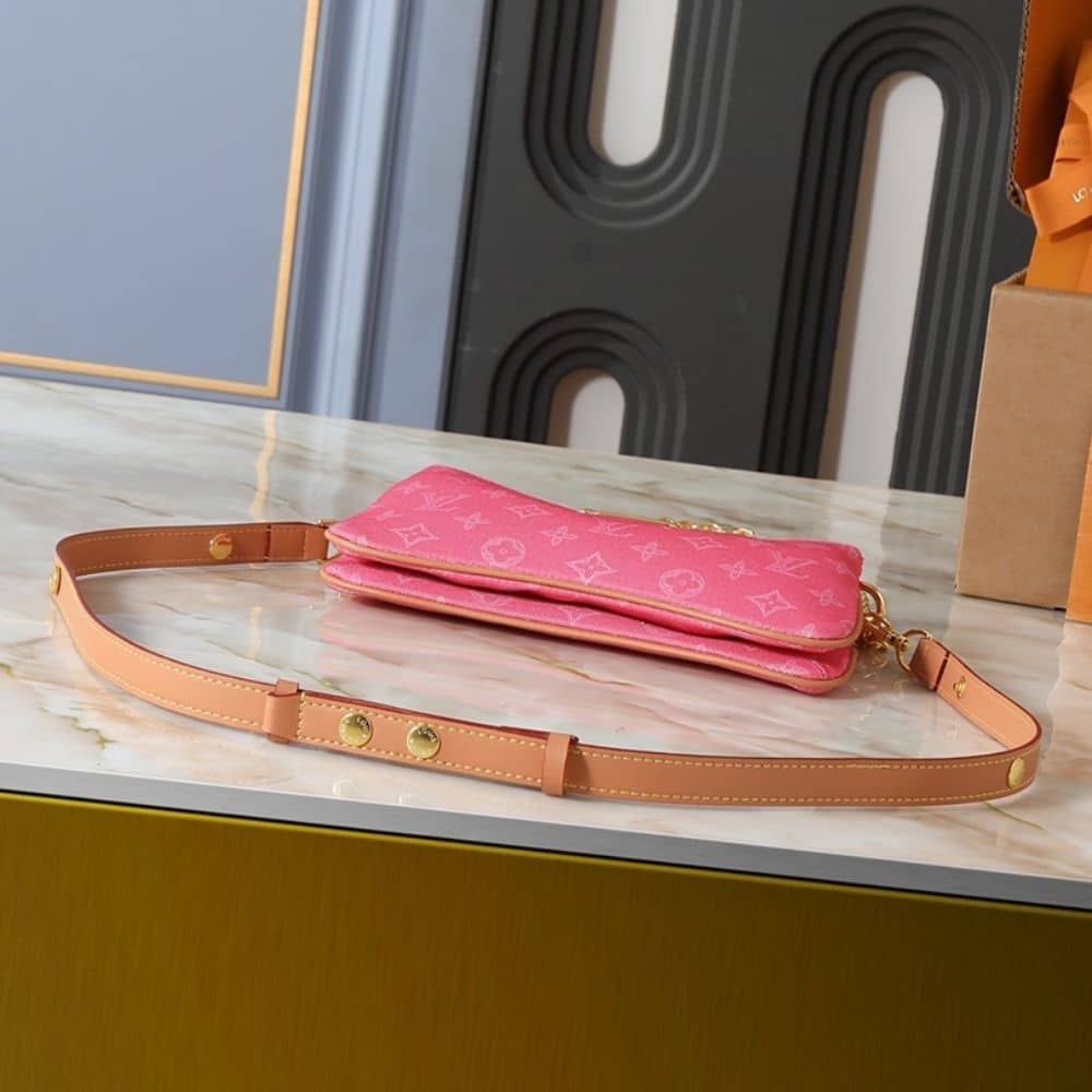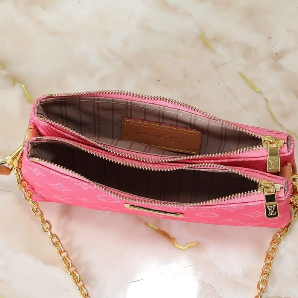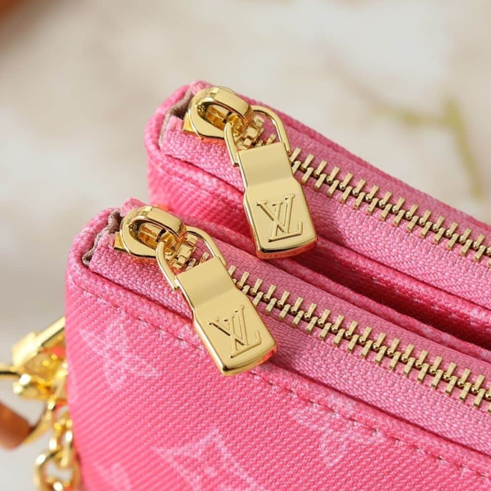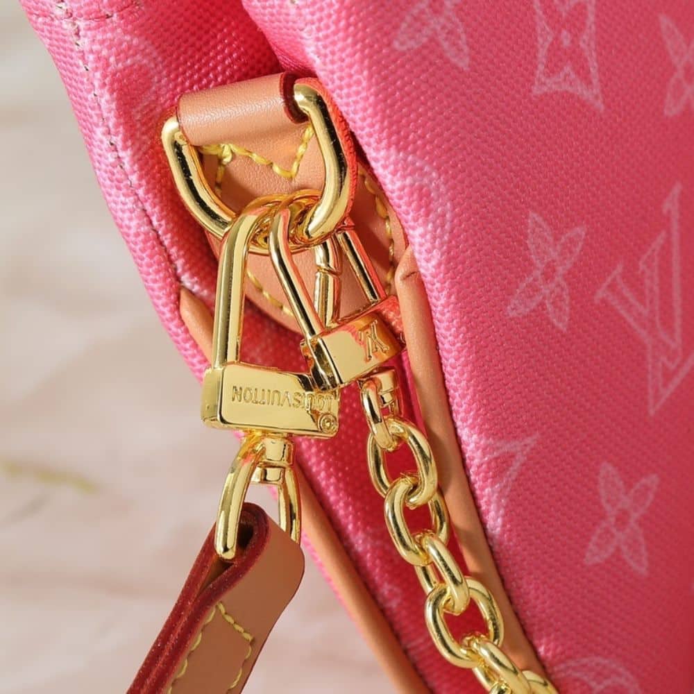 This vibrant edition of the Liv Pochette is designed in celebration of the 130th anniversary of the Louis Vuitton Monogram. Offered in a chic Rose Ruban hue, it features the iconic pattern set against linen and canvas. The elegant chain matches the signature plaque in a sleek gold-toned finish.