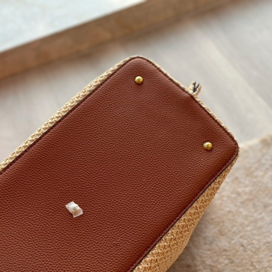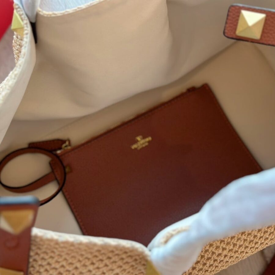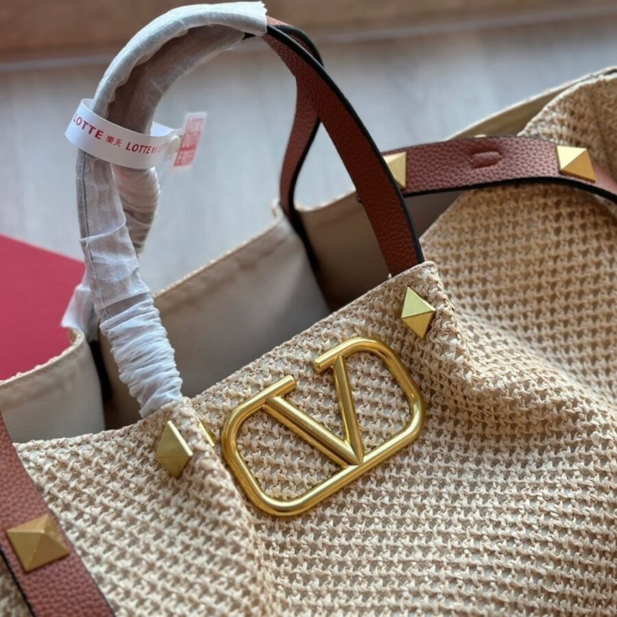 Valentino Garavani medium straw Summer Tote bag featuring a metallic VLogo Signature and red leather detail on the sides. The shoulder strap features the iconic maxi studs.